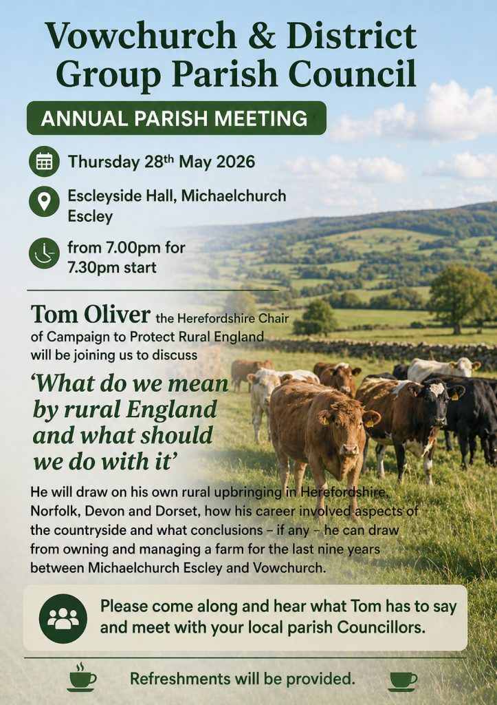 The Annual Parish Meeting will take place on Thursday 28th May 2026 at Escleyside Hall, Michaelchurch Escley, starting at 7:00pm.