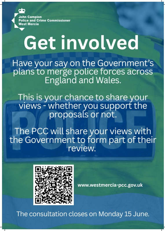 • Further information: https://www.westmercia-pcc.gov.uk/get-involved/consultations-and-surveys/public-consultation—police-force-mergers